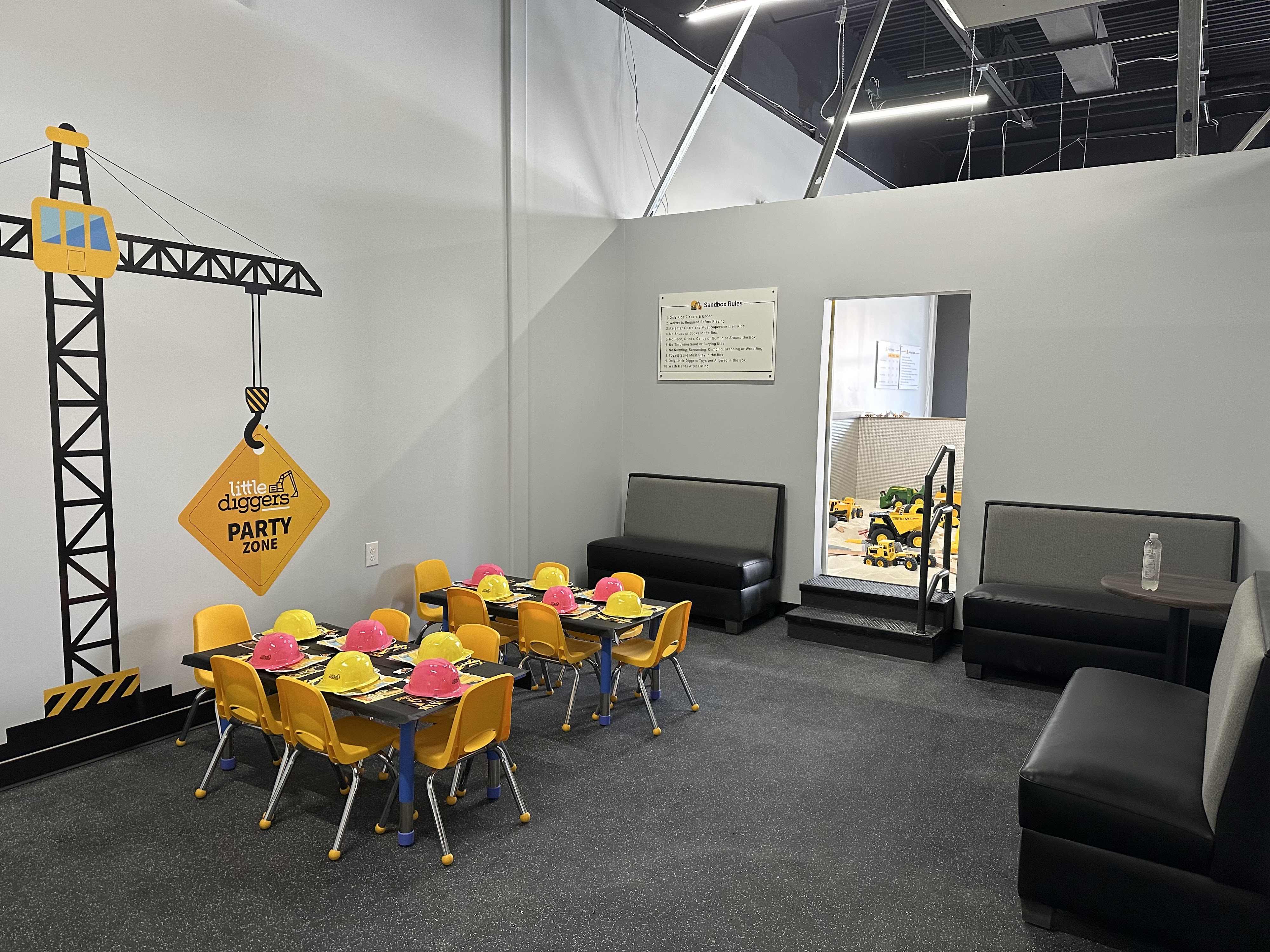 Located in the Streets of West Chester near Top Golf, Little Diggers West Chester offers a 1,200-square-foot indoor sandbox where children 7 and under can dig and play with over 200 construction-themed toys. Parents value the clean, safe environment, with reviews noting, “The sand is always clean, and there’s plenty of room for kids to play.” Our space provides free Wi-Fi, a coffee station, and plenty of seating, making it a comfortable spot for your family. Book a construction-themed birthday party or visit us for open play today!